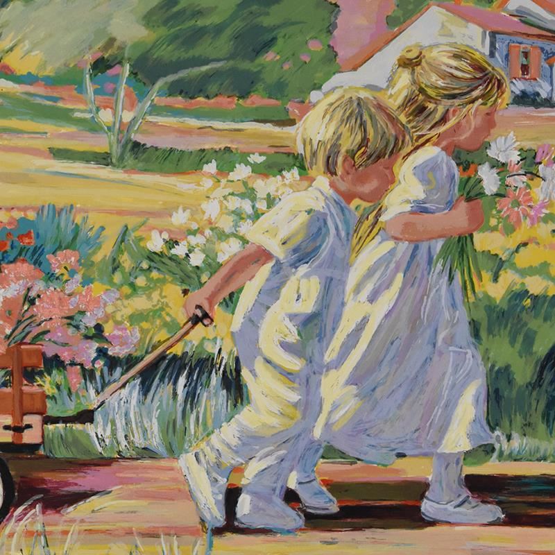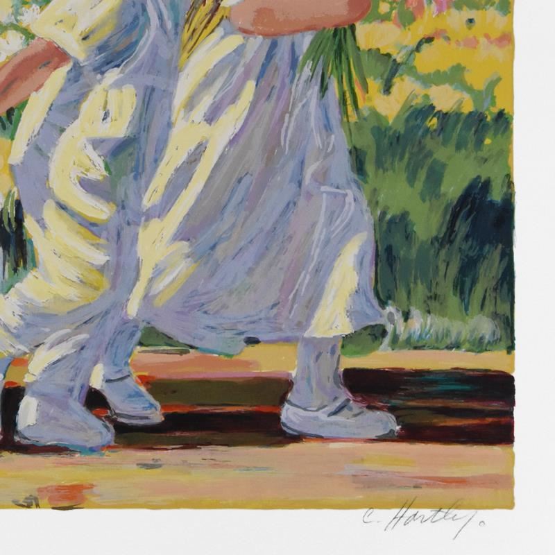 "Taking Puppy Home" is a hand embellished limited edition lithograph on paper by Corinne Hartley, numbered and hand signed by the artist. Includes Letter of Authenticity. Measures approx. 22" x 15.5" (border), 20" x 13.5" (image). ** Please note: due to the age of this piece there is some wear on the corners and edges; particularly, the bottom-right border area is creased. **