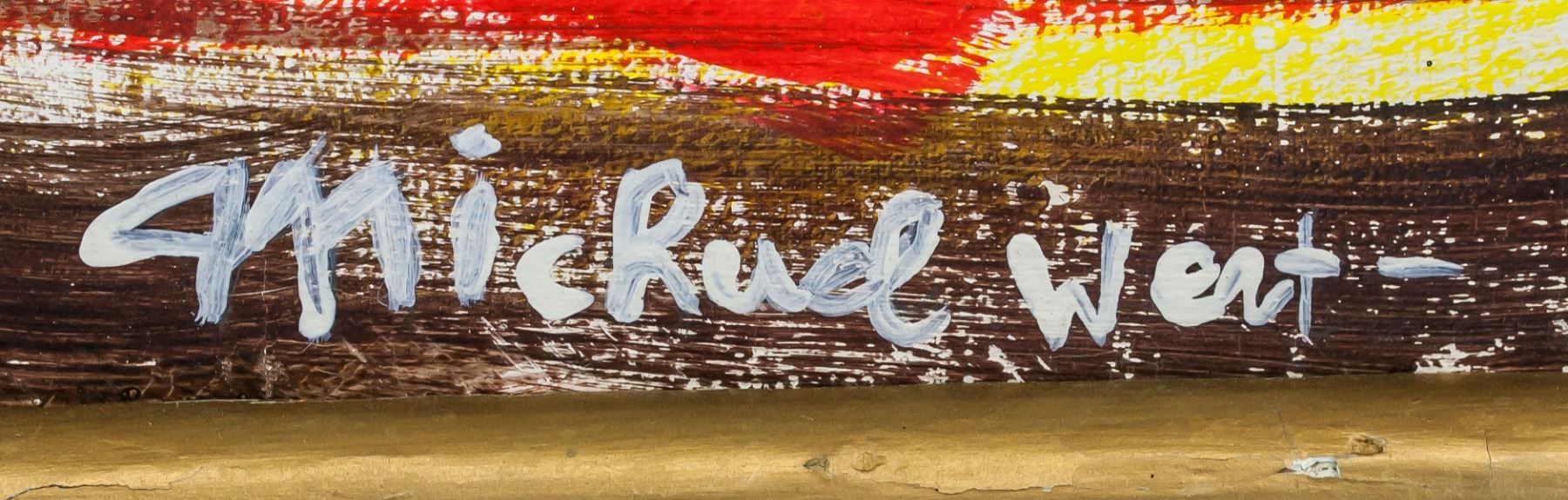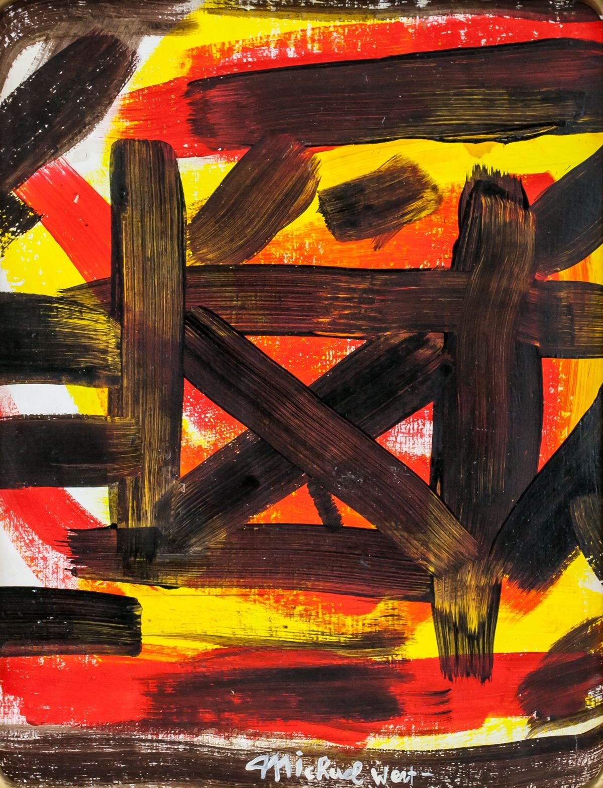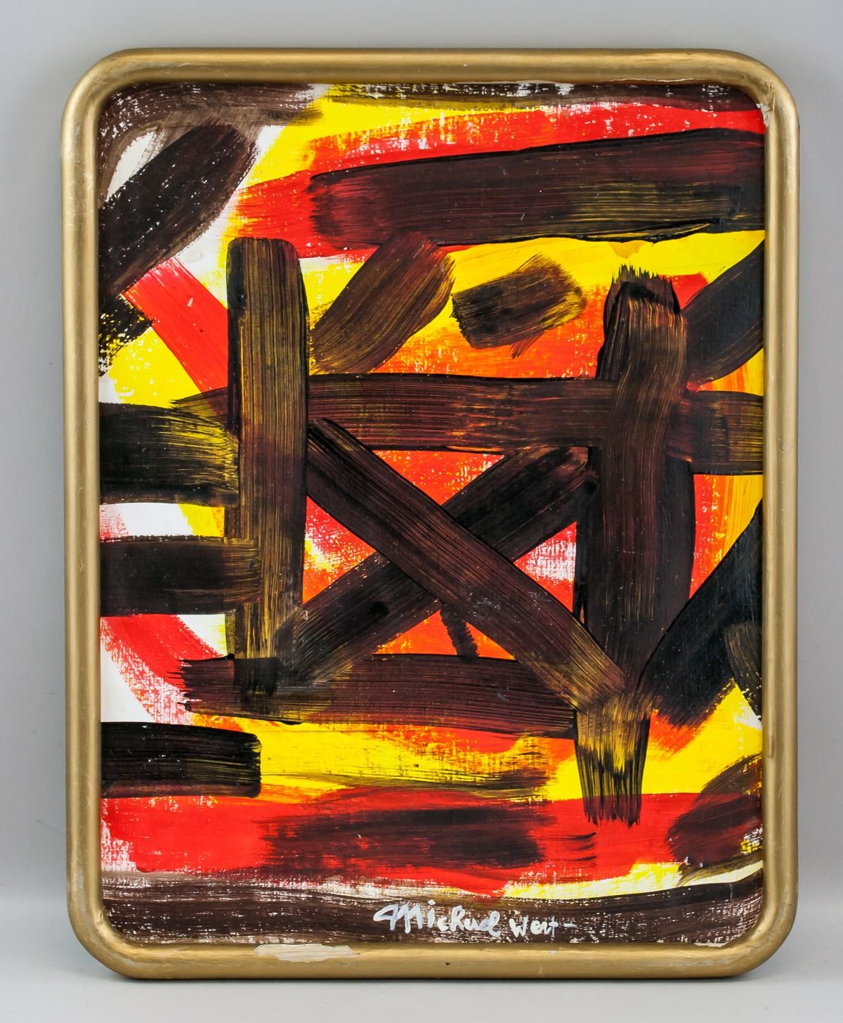 Oil on canvas, framed. Featuring an abstract expressionist composition. Signed Michael West on the lower edge. Attributed to Corinne Michelle West (1908-1991, American. 44 x 34 cm (17.3 x 13.4 inches). Framed size: 47 x 37 cm (18.5 x 14.5 inches). PROVENANCE: Southern Ontario estate