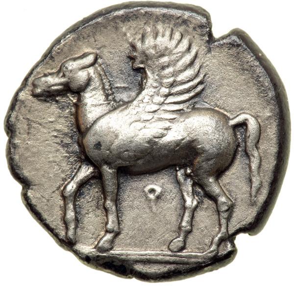 Corinthia, Corinth, 360-338 BC. AR Stater (7.67 g). Pegasos with curled wing, walking left. Reverse: Helmeted head left of Athena; above, Nike flying right; in lower right field, dolphin. Cf. Calciati I, 325/1, only curled-wing Pegasos; SNG Delepierre --. Rare type, and this variant possibly unpublished. Somewhat porous; well-centered and nicely struck. Very Fine to Extremely Fine.