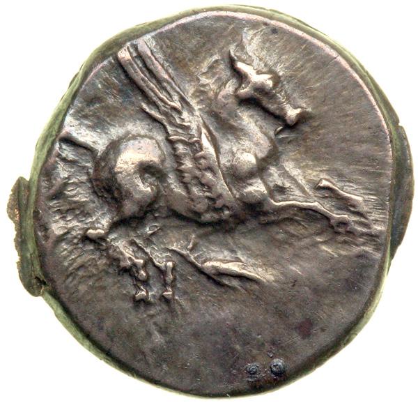 Corinthia, Corinth(?), 3rd Century BC. AR Drachm or Half Victoriatus (1.70 g) struck at an uncertain mint. Pegasos flying right, grain stalk beneath. Reverse: Head right of the nymph Peirene (or Aphrodite?), monogram in lower right field. SNG Lockett 2317 (this coin); cf. Dewing 1780 for dating to c. 350-300 BC. Beautifully toned; Extremely Fine.