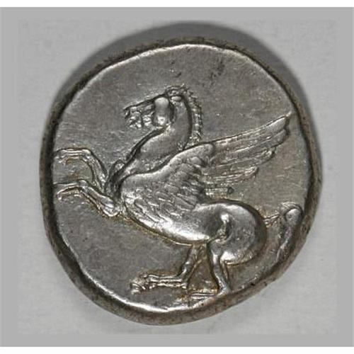 <B>Corinthia, Corinth.</B></I> After 307 B.C. AR stater (19 mm, 8.54 g). Imitative issue. Pegasos flying left / Laureate and helmeted head of Athena left; axe behind. Pegasi I p. 277, 494; Ravel 1119. Good VF.<BR><BR><b>Shipping:</b> Coins & Currency (<a target="_blank" href="http://www.heritageauctions.com/common/shipping.php">view shipping information</a>)