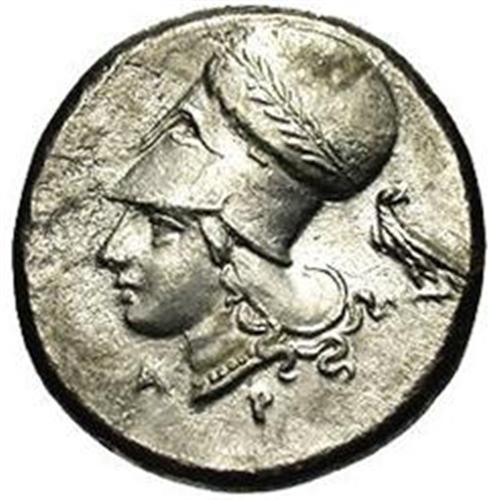 <B>Corinthia, Corinth.</B></I> Ca. 345-307 B.C. AR stater (20 mm, 8.22 g). Pegasos flying left; koppa below / Laureate and helmeted head of Athena left; A-P flanking neck, behind, eagle standing left, head reverted. Pegasi I p. 262, 426; BCD 101; Ravel 1008. Good VF, porous.