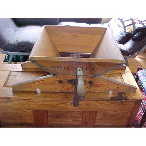 Corn Grinder, signed on one side (Hoosier) in black letters. Detachable handle crank. Feeder bin size 19 X 19 X7" high overall size base which would sit on a barrel 11" 21" long. Has red scroll striping . The other side has in red letters, fruit crusher. good grinder and wood