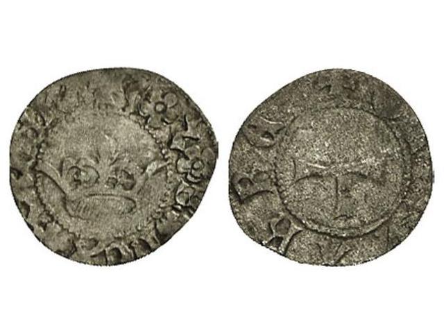 Cornado. JUAN I y BLANCA. Anv.: ¶I.Z.B.REX.Z.RENA (separación por flores de 5 pétalos). Corona. Rev.: ¶Corona NAVARRE(¶). Cruz sin orla. 0,91 grs. Ve. (Acuñación floja en parte). ESCASA. Cru.VS-257; IBL-6. MBC.