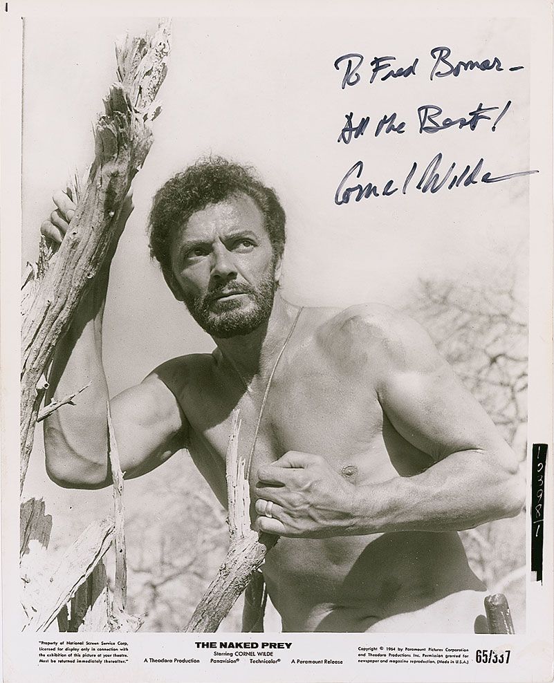 Glossy 8 x 10 Paramount promotional photo for The Naked Prey, signed and inscribed in black felt tip “To Fred Bomar—All the best! Cornel Wilde.” In fine condition, with a couple scattered light creases and some adhesive remnants to lower right corner.
