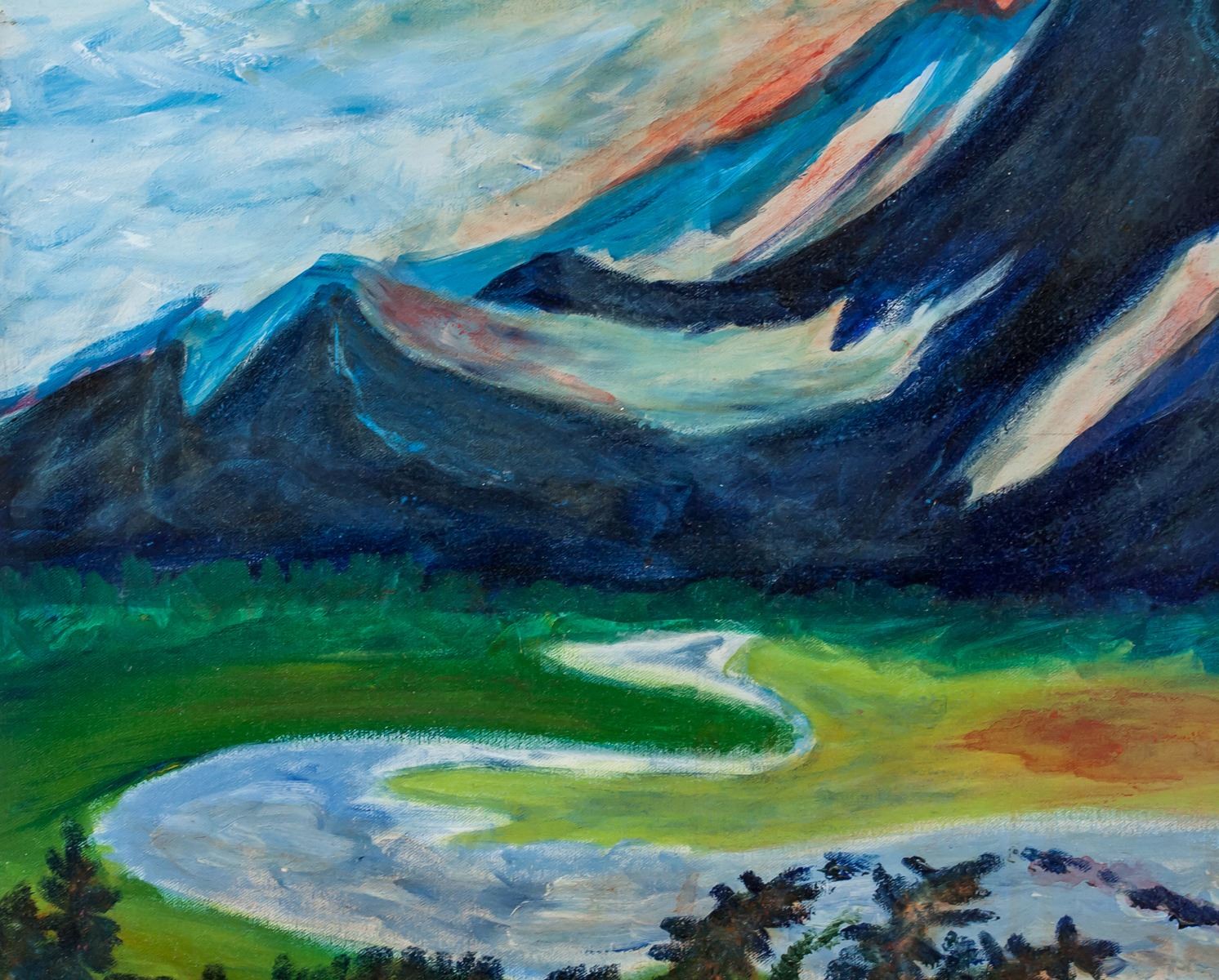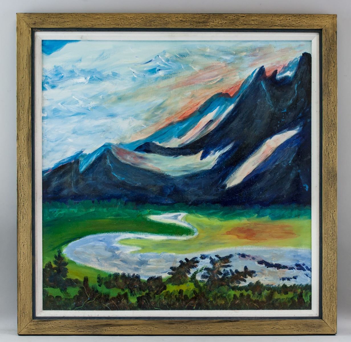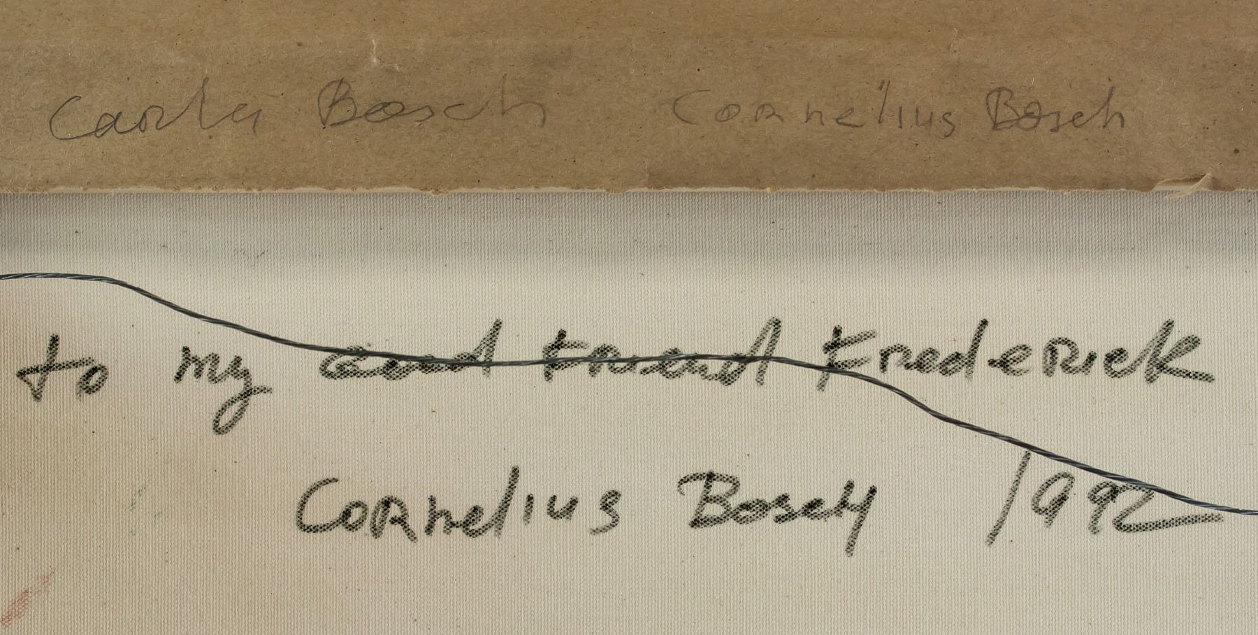 Oil on canvas, framed. Featuring mountainous landscape. Verso with dedication, "to my Good Friend Frederick - Cornelius Bosch 1992." Cornelius Bosch (1956-2011, South African). 60 x 60 cm (23.6 x 23.6 inches). Framed size: 71 x 71 cm (28 x 28 inches)