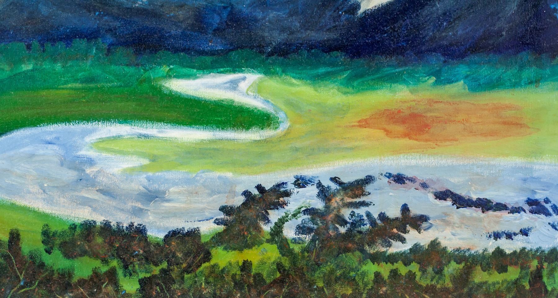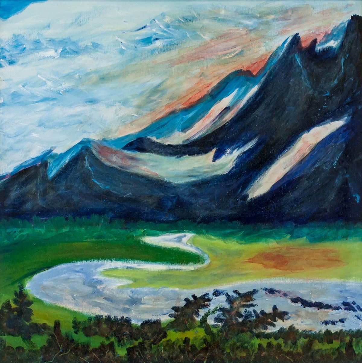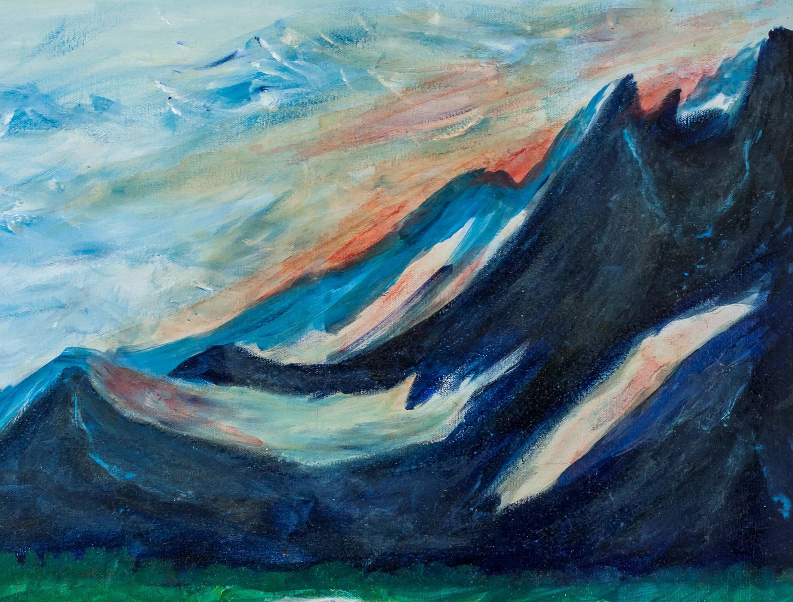 Oil on canvas, framed. Featuring mountainous landscape. Verso with dedication, "to my Good Friend Frederick - Cornelius Bosch 1992." Cornelius Bosch (1956-2011, South African). 60 x 60 cm (23.6 x 23.6 inches). Framed size: 71 x 71 cm (28 x 28 inches)
