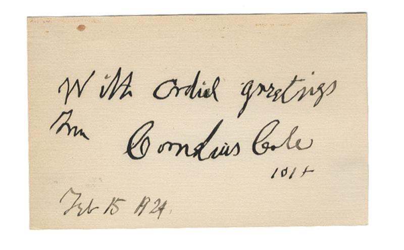 Cornelius Cole (1822 - 1924) Congressman and Senator from California. Signed card. 5" x 3 1/8". "With Crodial Greetings, From Cornelius Cole, Feb. 15, 1924" Light spot in upper left. Extremely Fine.