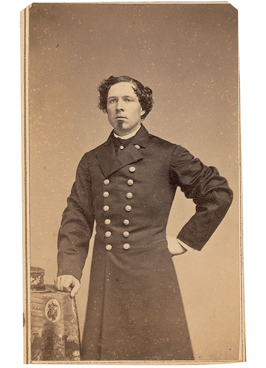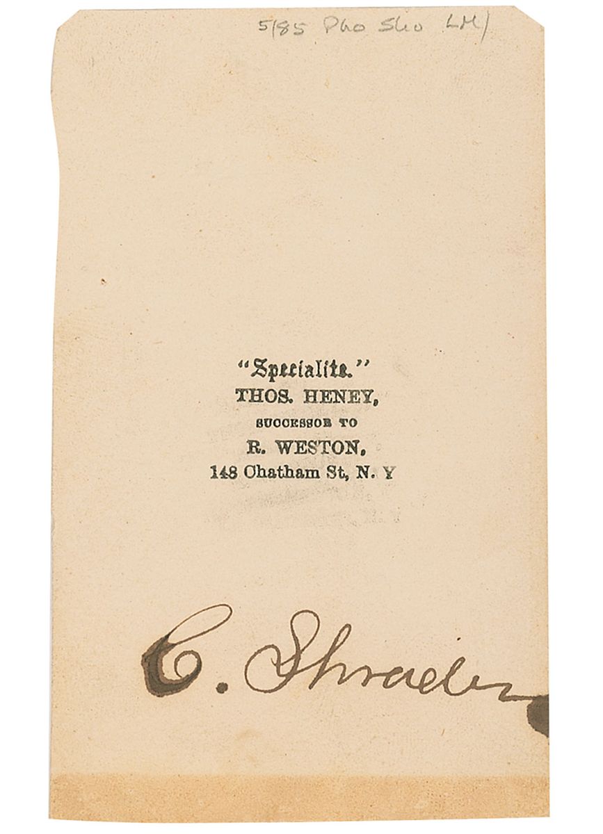 Union naval officer who served as an assistant engineer. Original 2.25 x 3.75 carte-de-visite photo by Heney of New York, signed on the reverse in black ink, “C. Schrader.” In very good condition, with light spotting to image, trimmed borders, some light ink spreading to beginning and end of signature, and a strip of toning to bottom edge on reverse.