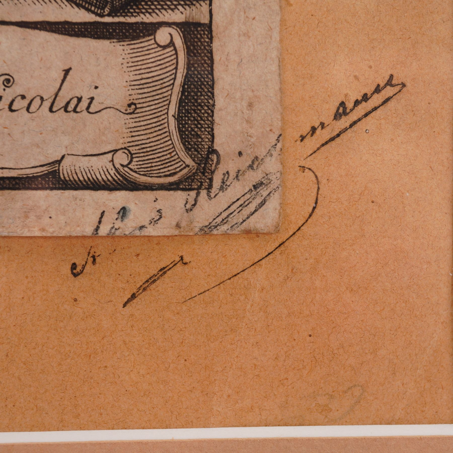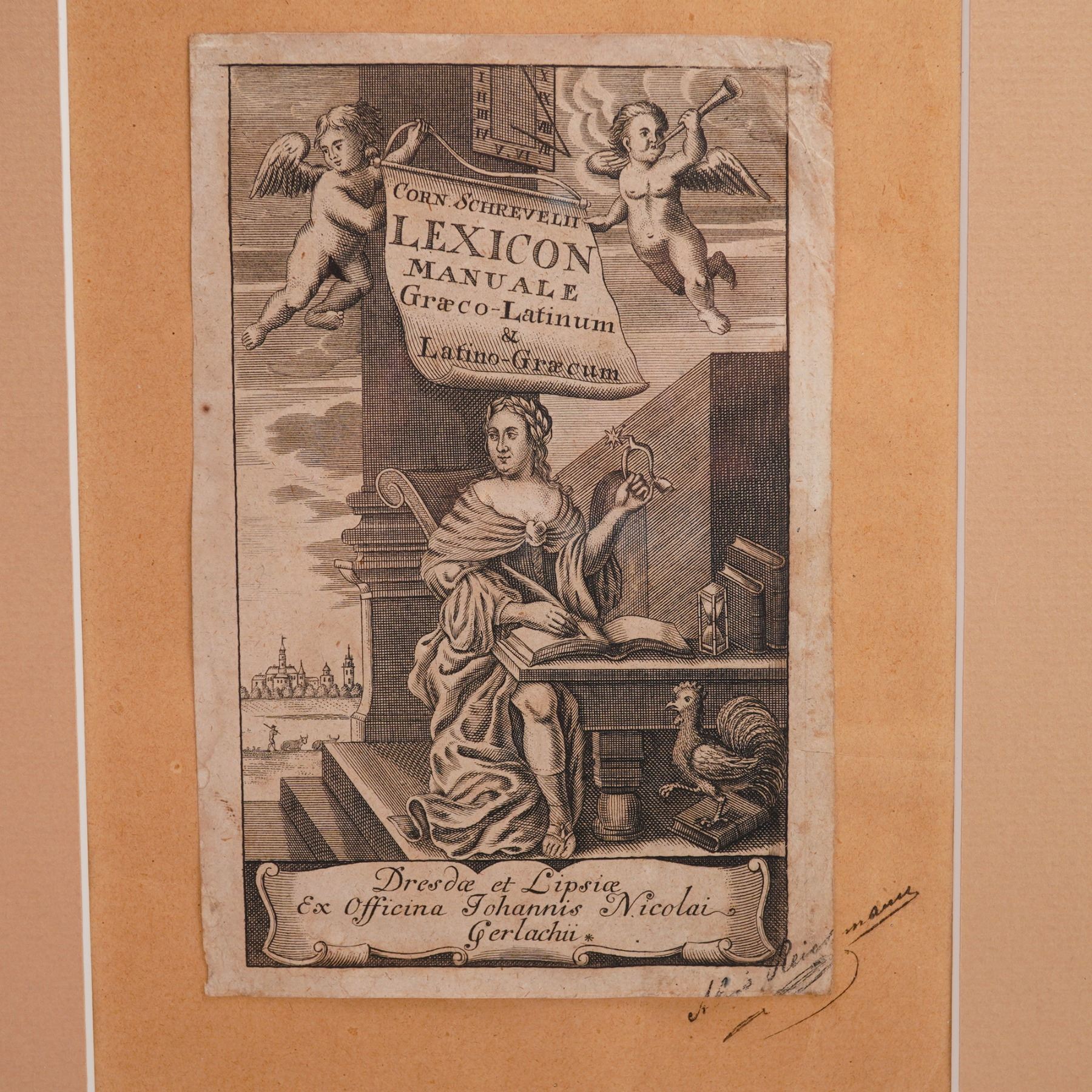 An exquisite 17th-century engraved title page from Cornelius Schrevelius's famed Lexicon Manuale Graeco-Latinum et Latino-Graecum, published by Johannis Nicolai Gerlachi in Dresden and Leipzig. This stunning allegorical frontispiece features classical imagery: a seated female figure representing wisdom or scholarship holds a key and compass, flanked by open books and a rooster, an ancient symbol of learning, while cherubs unfurl a title banner above. Elegantly signed in pen by an early owner, this rare bibliographic artifact is professionally matted and framed by The Art Shop, ready for display. The engraving is both a celebration of classical erudition and a work of art in its own right, ideal for collectors of early printed material, decorative arts, or academic history.