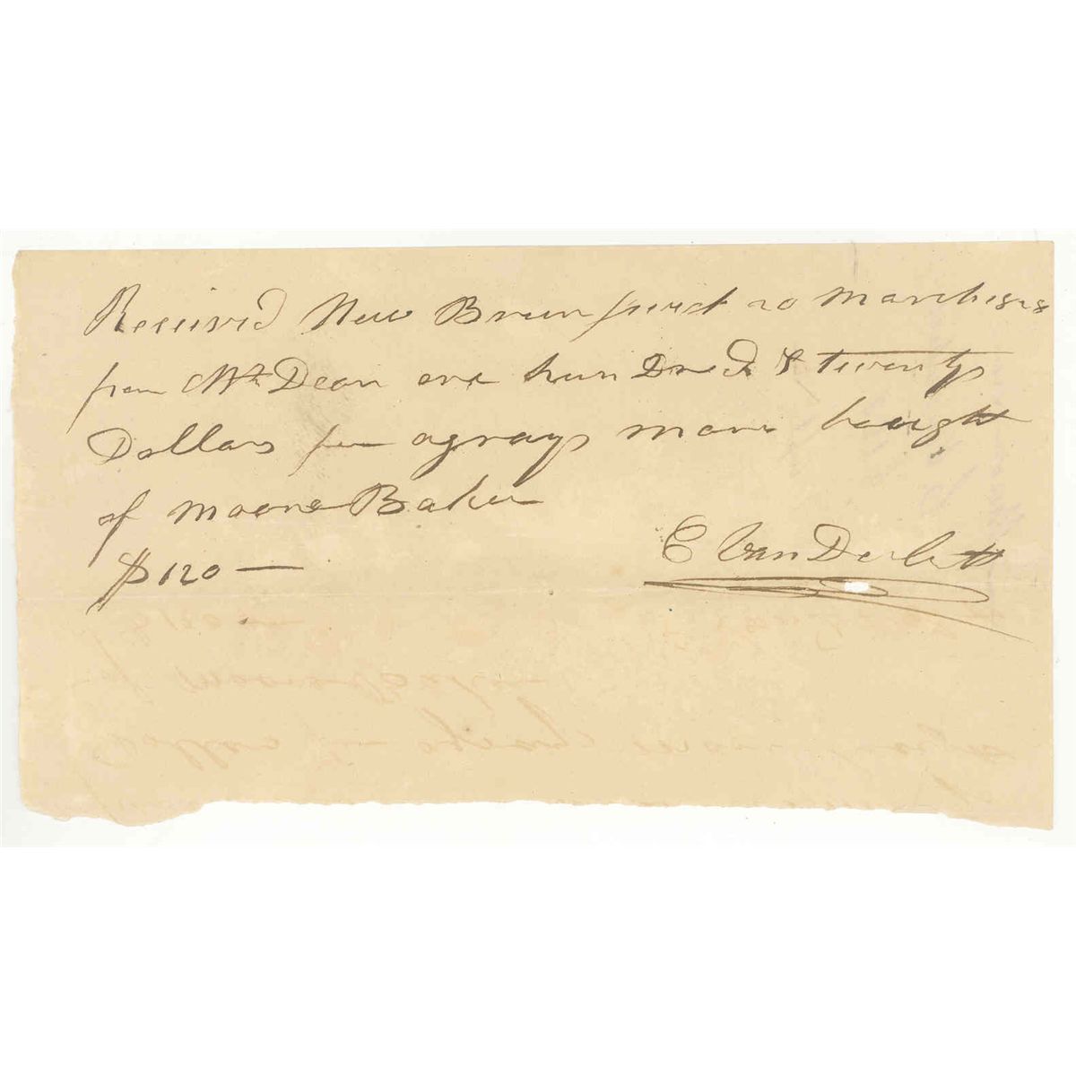American railroad pioneer and magnate Cornelius Vanderbilt, aka ''The Commodore'' document signed, dated 20 March 1828. Document acknowledges receipt ''…from Mr. Dean one hundred & twenty Dollars…'' and is docketed on verso. Document measures 7.25'' x 4.25'' with one small hole beneath Vanderbilt's bold ''C Vanderbilt'' signature. Uneven edges, else very good condition.