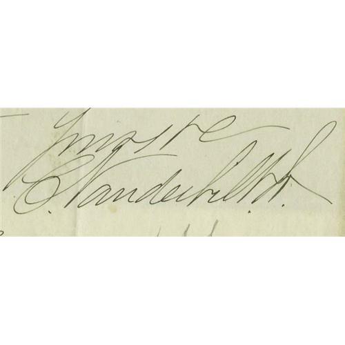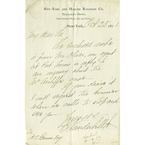 <B>Cornelius Vanderbilt II Autograph Letter Signed</B></I> "<I>C. Vanderbilt</B></I>". One page, 5.5" x 8.5", New-York and Harlem Railroad Co. letterhead, New York, October 25, 1871, to A. C. Brown. From the treasurer's office, this favorite grandson of the legendary Commodore Vanderbilt writes about a McAuliffe case in which he volunteers to "<I>...request the Coroner when he calls to stop by and see you...</B></I>" This railroad was one of the first railroads in the U.S. and possibly the first street railway, running north from Lower Manhattan to Harlem and beyond. It is now the Metro-North Railroad Harlem Line. Very good condition with folds and some minor stains, mounted at the top to a stiff card. <I>From the Henry E. Luhrs Collection.</B></I>