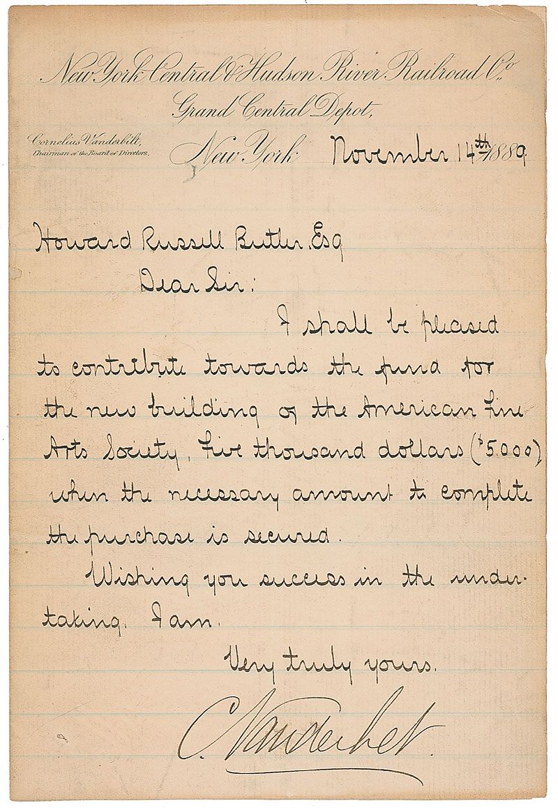 American businessman and philanthropist (1843–1899) who succeeded his father and grandfather as head of the New York Central Railroad. LS signed “C. Vanderbilt,” one page, 5.5 x 8, New York Central & Hudson letterhead, November 14, 1889. Letter to Howard Russell Butler. In part: “I shall be pleased to contribute towards the fund for the new building of the American Fine Arts Society, five thousand dollars.” In very good condition, with intersecting folds, one vertical fold passing through a single letter of the signature, light scattered creases and toning, and a couple small edge tears.