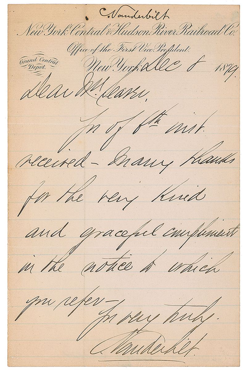 American businessman and philanthropist (1843–1899) who succeeded his father and grandfather as head of the New York Central Railroad. ALS signed “C. Vanderbilt,” one page, lightly-lined, 5 x 8, New York Central Hudson River Railroad Co. letterhead, December 8, 1879. Letter to Mr. Sears. In part: “Many thanks for the very kind and graceful compliments in the notice to which you refer.” In very good condition, with intersecting folds, scattered toning, and an ink notation to top edge.