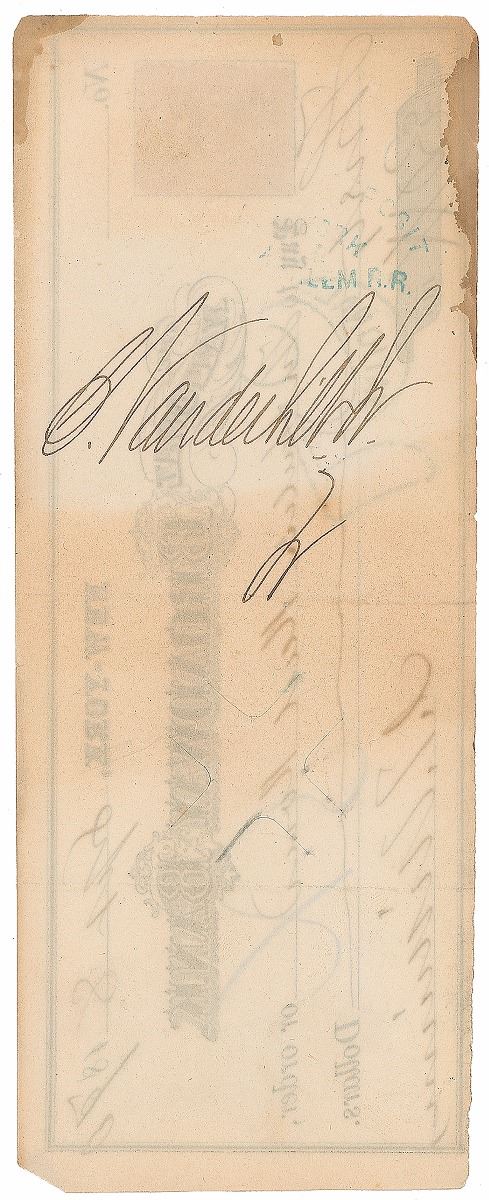 American businessman and philanthropist (1843–1899) who succeeded his father and grandfather as head of the New York Central Railroad. Two National Broadway Bank checks, both 7.5 x 3, filled out in another hand and signed by Vanderbilt, payable to the Harlem Rail Road Co. for $30, dated September 8, 1870, and July 5, 1871, both endorsed on the reverse by Vanderbilt, “C. Vanderbilt, Jr.” In overall very good to fine condition, with scattered toning and edge staining.