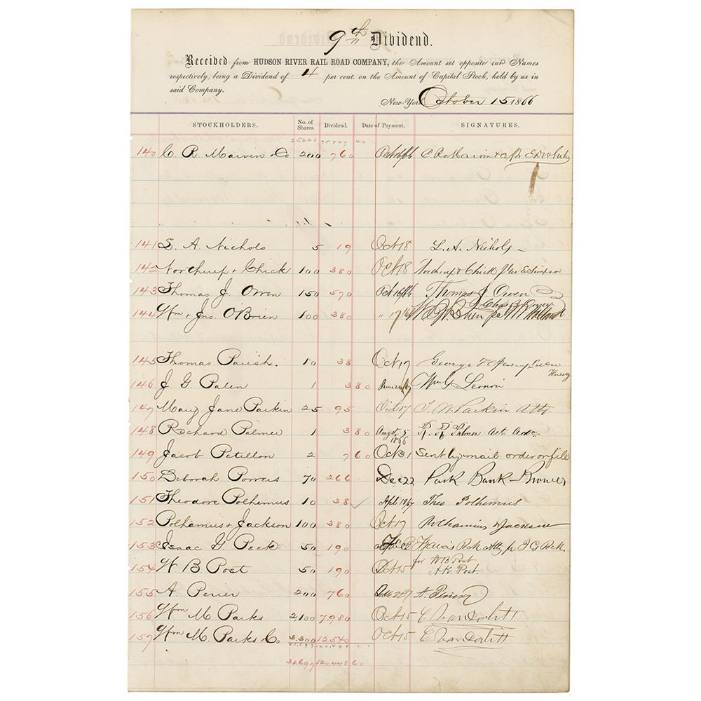 Twice-signed DS, signed "C. Vanderbilt," on behalf of William M. Parks, one page both sides, 11 x 17.25, October 15, 1866. Hudson River Railroad Company financial document listing stockholders' receipts for dividends, signed in ink by Vanderbilt to confirm receipt of $20,520 as a dividend for 5400 shares held by Parks. Reverse is also signed by four members of the Schermerhorn family, as well as by James Roosevelt, the eldest son of Franklin D. Roosevelt. In fine condition.