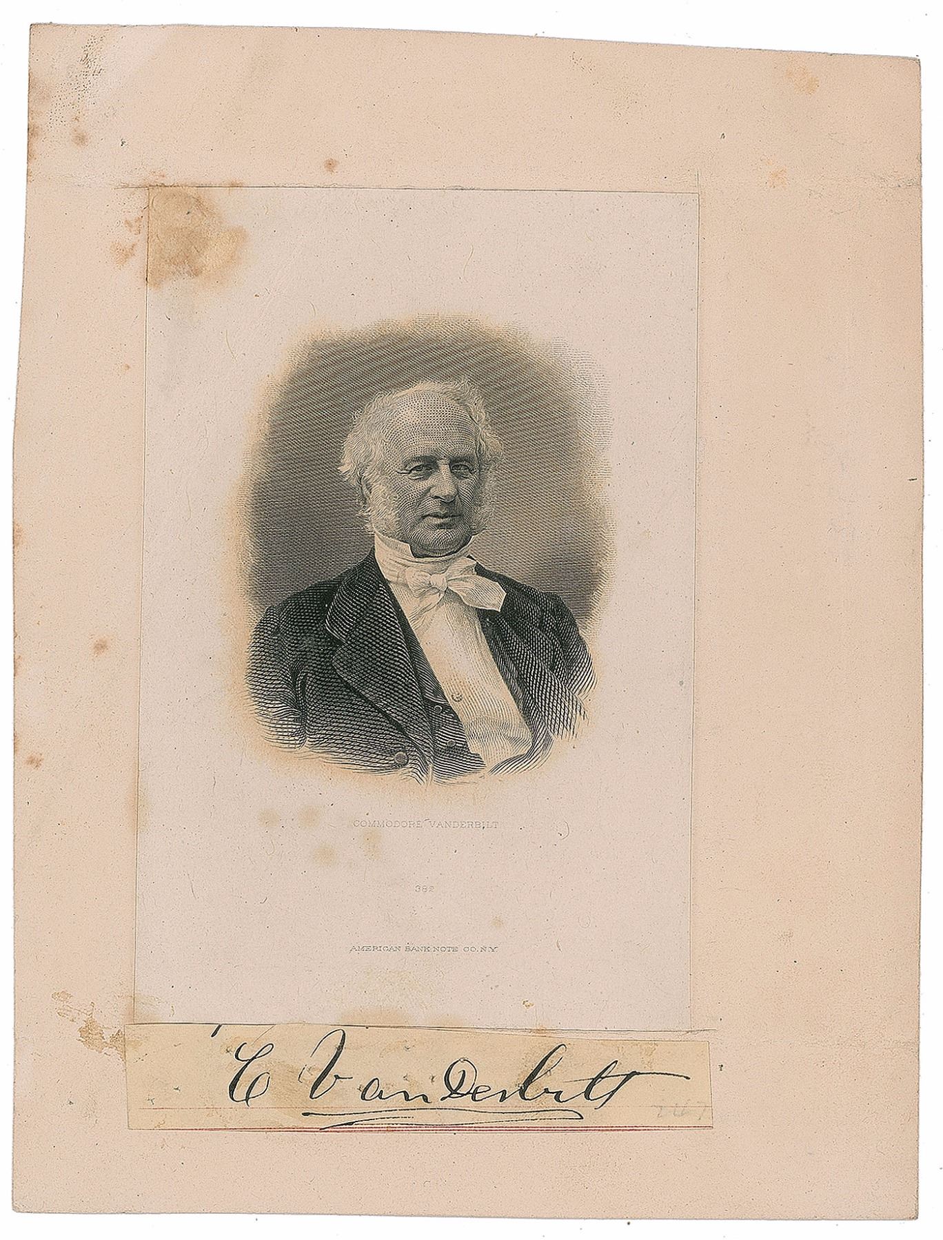 Business magnate and philanthropist (1794–1877) who built his wealth in railroads and shipping as owner of the New York Central Railroad. Ink signature, "C. Vanderbilt,” on an off-white 3.25 x .5 slip affixed to a larger card that also bears an engraved portrait. In fine condition, with scattered toning from adhesive.
