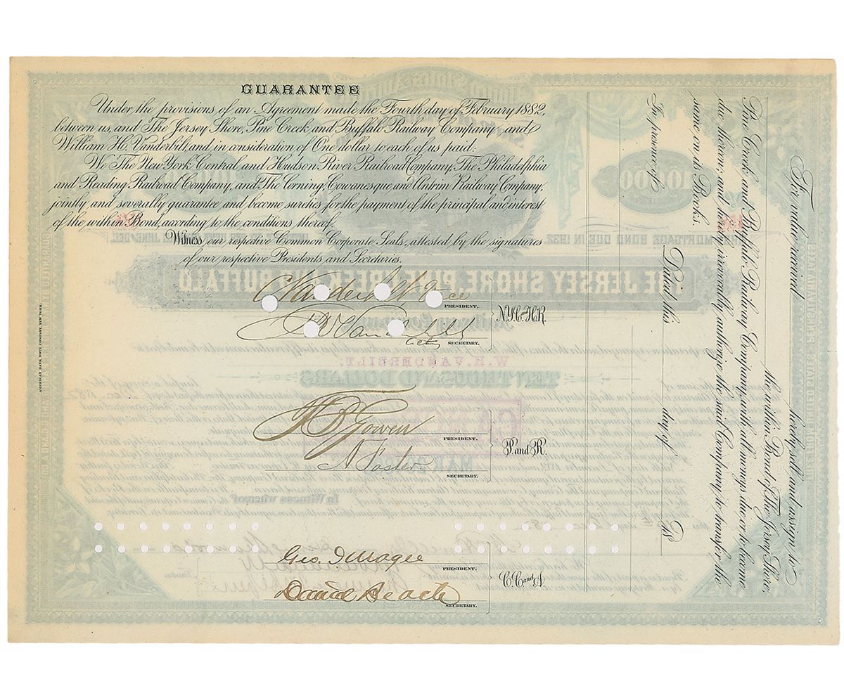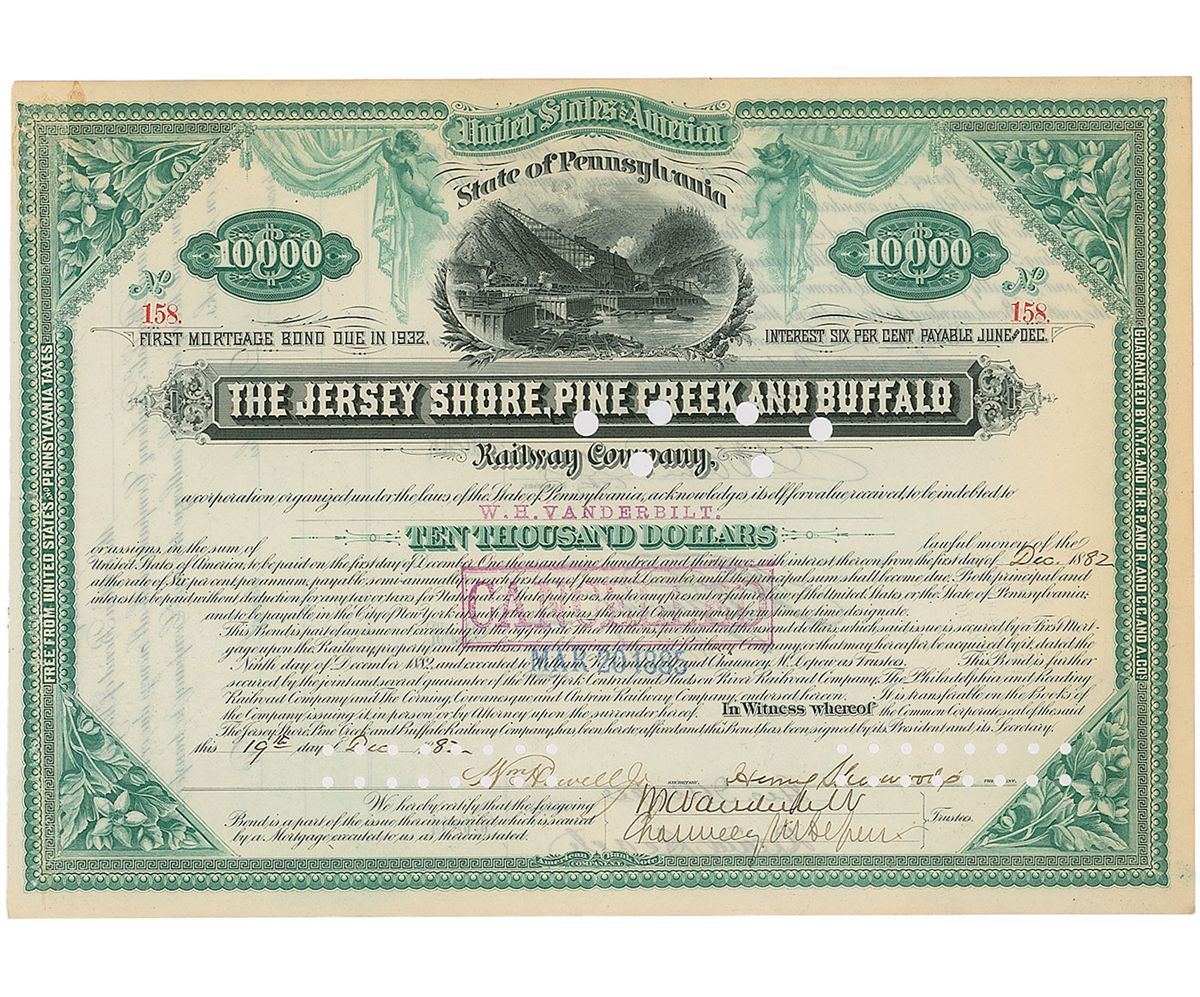 Partly-printed DS one page, 12.5 x 9, December 19, 1883. Engraved $10,000 first mortgage bond certificate for the Jersey Shore, Pine Creek and Buffalo Railway Company, issued to William Vanderbilt, signed on the front “W. Vanderbilt,” and also signed by Chauncey Depew, and signed on the reverse by Cornelius and Frederick. The detached sales receipt is included. In very good condition, with cancellation holes through signatures on reverse, other cancellation holes, and a stamp to center of document. Accompanied by five 5.5 x 8.25 individual sketches of the Vanderbilts and Depew.