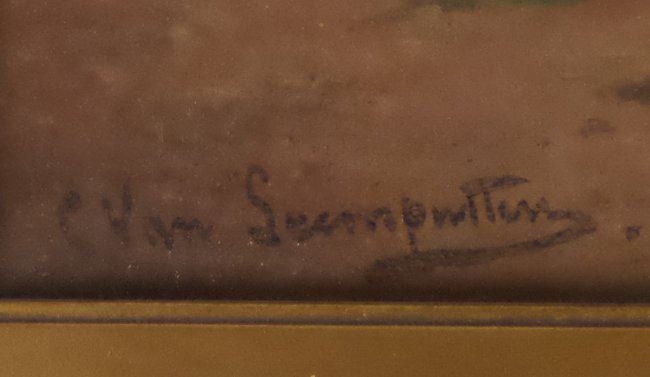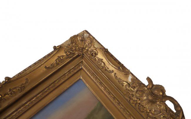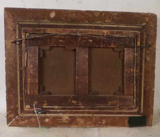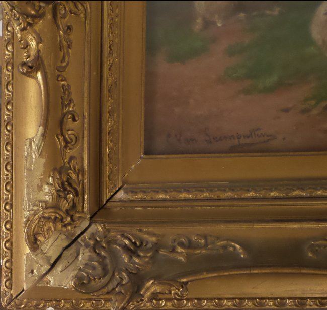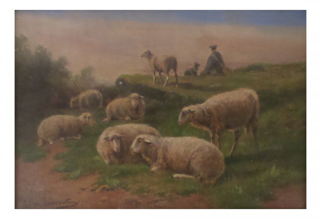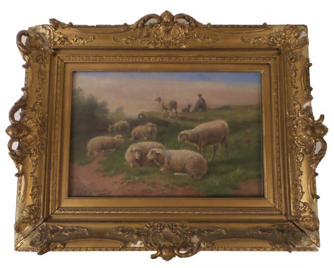 Framed oil on canvas of sheep grazing. [Art: 10 1/2" x 17"; Frame: 18 1/2" x 23 1/2"]. Not examined out of frame.