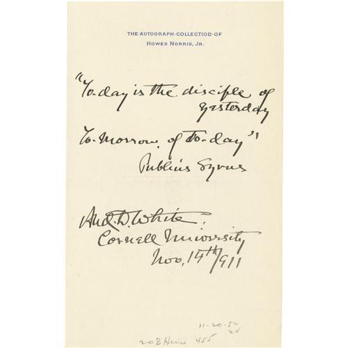 <B>Cornell University Autograph and Memorabilia Collection.</B></I> A research university based in Ithaca, New York, Cornell is the newest of the "Ivy League" universities. Ezra Cornell and Andrew Dickson White, who both valued egalitarianism, science, and education, founded it in 1865. Cornell said at the time "I would found an institution where any person can find instruction in any study." His dream came true, as Cornell has grown to be one of the top institutes of higher learning in the world with a current enrollment of about 20,000 students. Offered here is a collection of autographed material relating to this university. Just a few of the more than 20 items in this lot are described below: <BR><BR>Ezra Cornell. Co-Founder. ALS, DS (check), Signature (clipped from a letter). <BR><BR>Andrew D. White. Co-Founder. TLS (3), AQS, LS (3). <BR><BR>Souvenir program. Fall Regatta of the Cornell Navy, 1873. <BR><BR>Jacob Gould Schurman. President of Cornell (1892-1920). TLS (4), Signature. <BR><BR>Other names represented here are: H. McCandless, William I. Myers, George H. Sabine, Livingston Farrand, and T. F. Crane. Items generally are in fine condition. From the Henry E. Luhrs Collection. Accompanied by LOA from PSA/DNA.