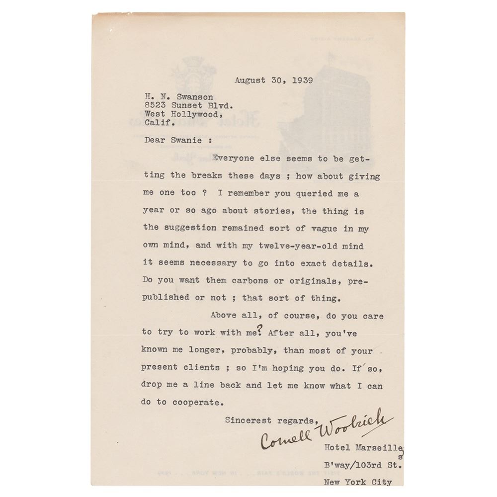 TLS, one page, 6 x 9, on the reverse of Hotel Marseilles stationery, August 30, 1939. Letter to literary agent H. N. Swanson, in full: "Everyone else seems to be getting the breaks these days; how about giving me one too? I remember you queried me a year or so ago about stories, the thing is the suggestion remained sort of vague in my own mind, and with my twelve-year-old mind it seems necessary to go into exact details. Do you want the carbons or originals, pre-published or not; that sort of thing. Above all, of course, do you care to try to work with me? After all, you've known me longer, probably, than most of your present clients; so I'm hoping you do. If so, drop me a line back and let me know what I can do to cooperate." In fine condition, with mailing folds, and staple holes to upper left corner.