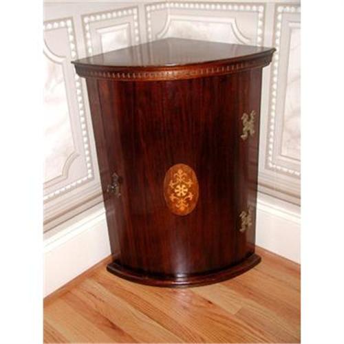 Rich mahogany corner cabinet from England C.1850-65 has a center inlay of satinwood. Traditional carving on the upper edge. Two triangular storage areas inside. The back of the door inside is ribbed. Original "H" brass hinges and brass decorative working key and escutcheon. Tall enough for use on floor alone,table or counter as well as back brackets for hanging. Excellent condition. Measures 26H X 20L X 14D.