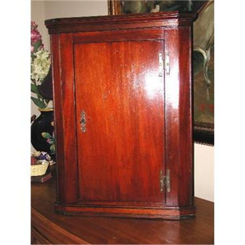 19th century C.1865-75 mahogany corner cabinet was actually built into a house in England as can be seen by the bits of paint and back structure of the wide pieces of mahogany. The door being one piece alone. Four holes in back for nailing into place. The wood has aged to a beautiful patina. Two scrolled shelves inside with an 8.5 depth on each. Original brass hardware with working lock and key. Wonderful condition. Measures 26.5H X 19L X 11D.