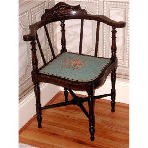Unusual 19th century corner chair from England has beautiful inlay center back of ebony,fruitwood and satinwood. An inlay line traces the outline of the arms as well as the apron seat. Original blue needlepoint with center floral design on the seat with gemp trim and brass nailheads. Turned legs with grooving which appears again on the lower support runners. Very slight age wear to edge of seat,otherwise excellent condition. The seat has been restuffed and webbed with new under liner for support. Chair very sturdy.