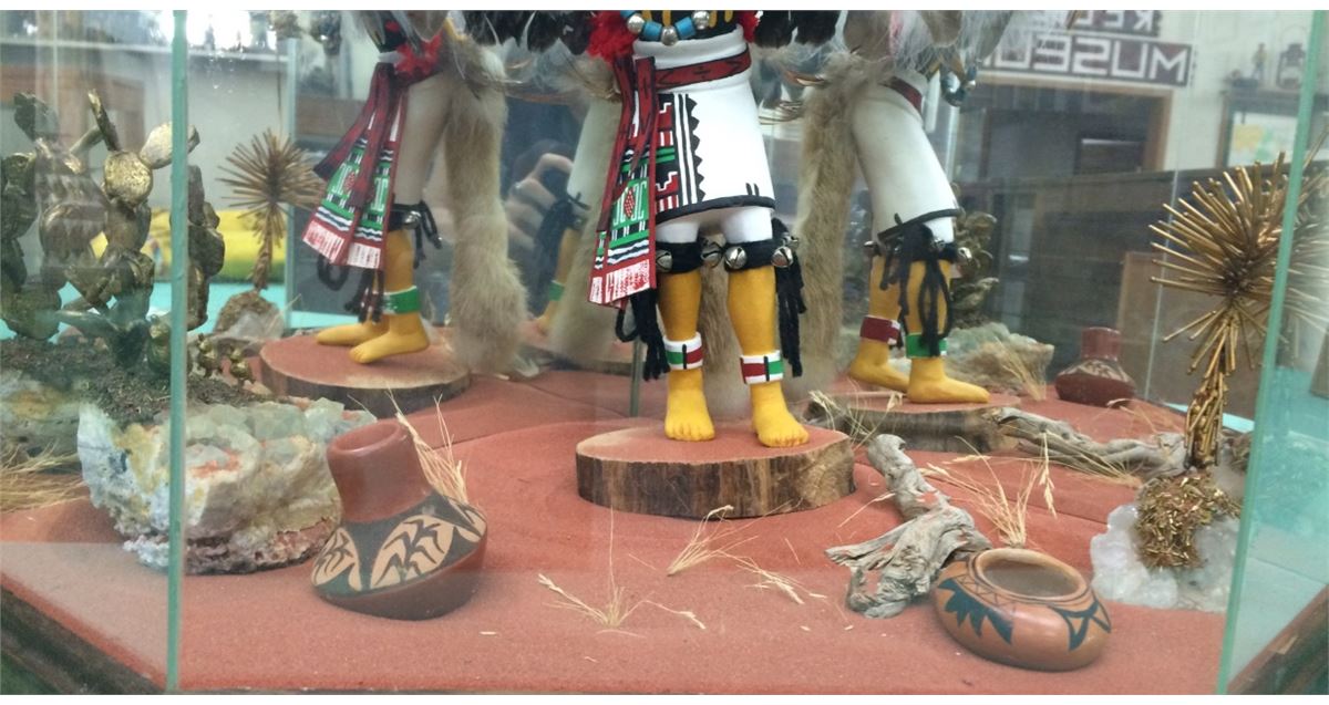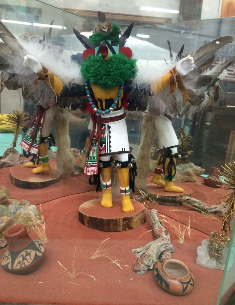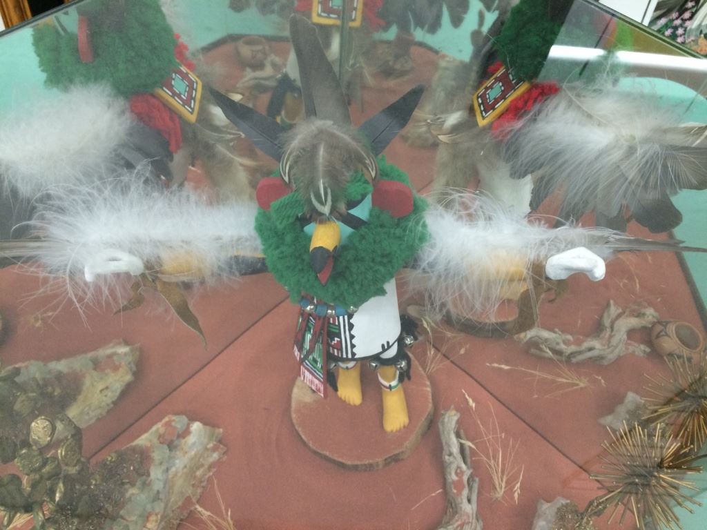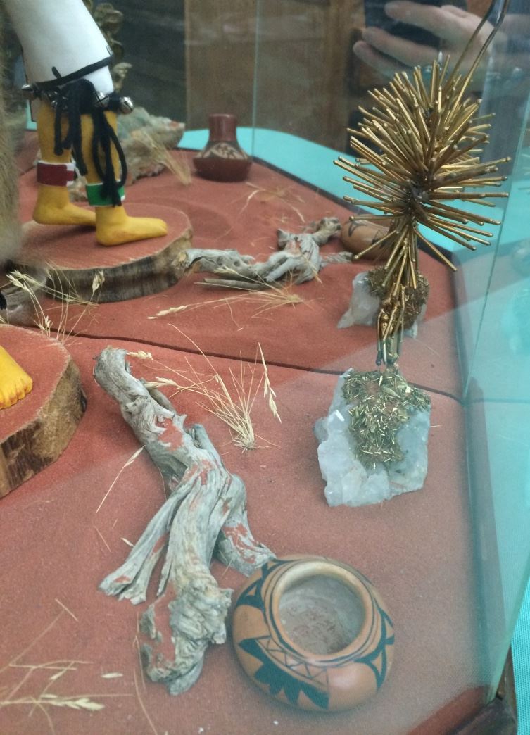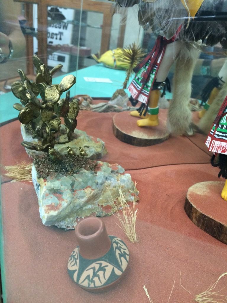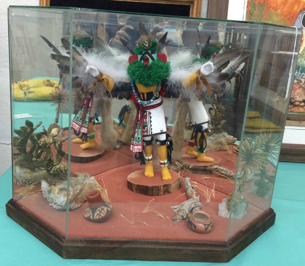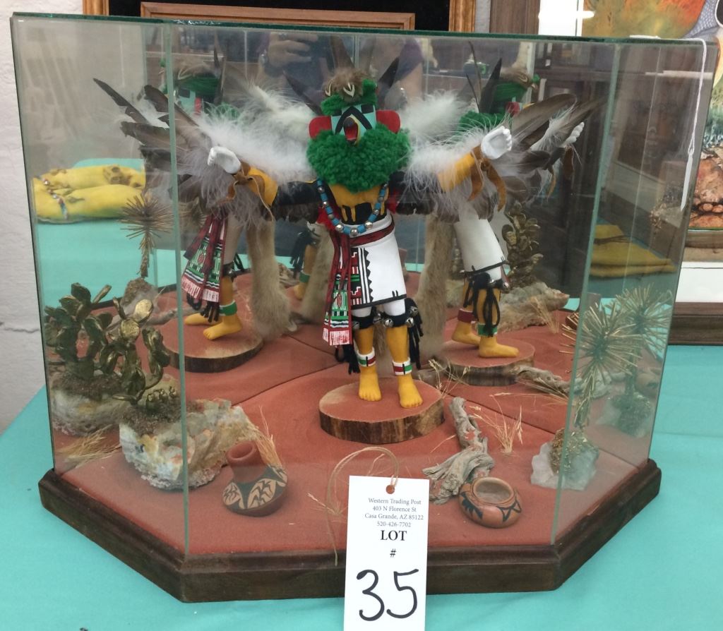 This vintage Navajo display measures 20” at the widest point and is 14.5” front to back and 15” tall. There are several decorative items inside the glass box such as a Navajo Kachina doll, 2 Navajo pots, 2 cactus statues made of quartz rock and brass and lots of red sand. Good condition. Shipping: since the top comes off and the items inside are movable, the items inside will have to be taken out and individually packaged to be shipped. It would be better if the buyer can pick it up or have it picked up. However, if you want us to ship it, there will be a $25 handling / packaging fee for shipping this lot. The actual cost of postage will be added on top of that.
