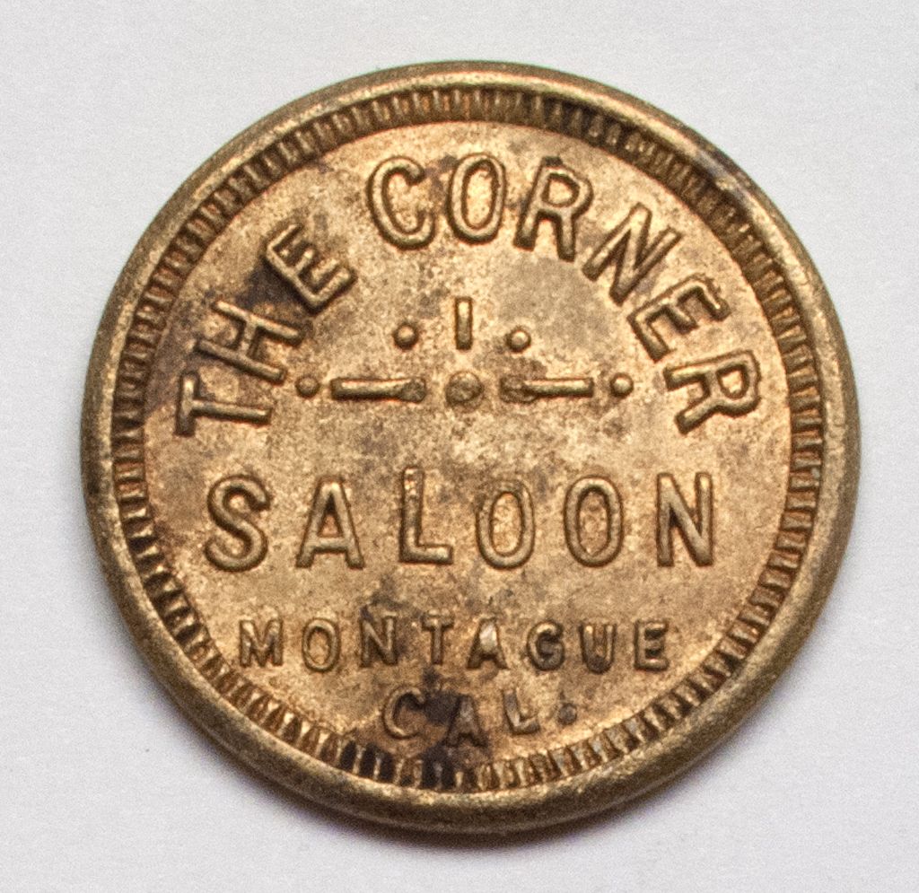 Advertising token from The Corner Saloon in Montague, CA. This is a brass token with a blank reverse. There is some staining but it is in nice condition.City: MontagueCounty: Siskiyou State: CADate: