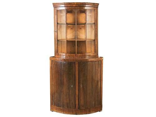 Walnut veneered pinewood, 2 doors, 1 glass door, walnut decoration. Biedermeier, early 19th century. Size: 187x67x67 cm.