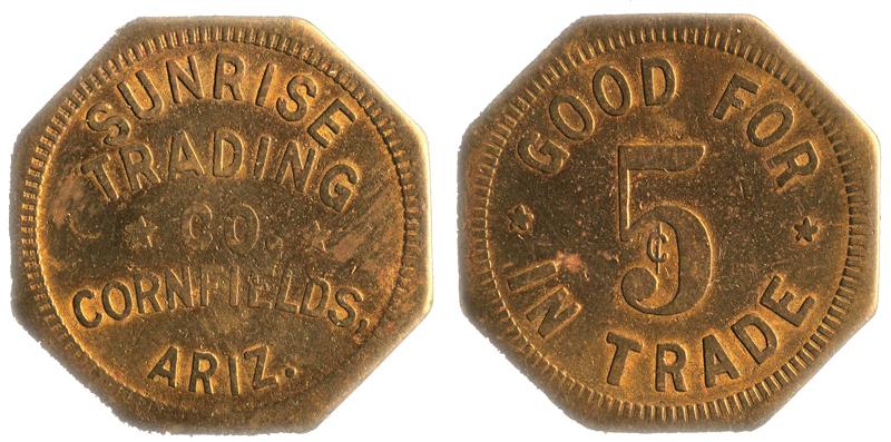 Obverse: Sunrise / Trading / Co. / Cornfields / Ariz.; reverse: Good for / 5 In Trade. 26mm, R6. Good condition. Cornfields is on the Navajo Indian Reservation along Pueblo Colorado Wash. It was named appropriately for the corn grown there for food.