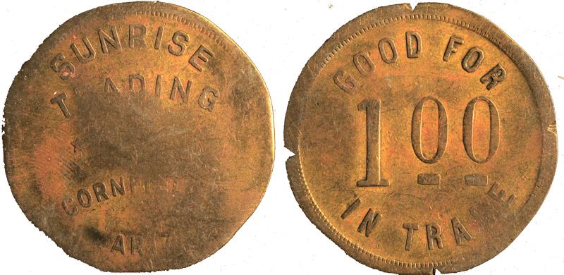 Obverse: Sunrise /Trading / Co. / Cornfields / Ariz.; reverse: Good for / 1.00 / In Trade. 31mm, R6. Fair condition.