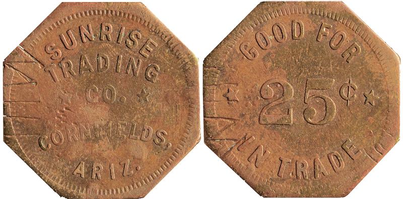 Obverse: Sunrise /Trading / Co. / Cornfields / Ariz.; reverse: Good for / 25c / In Trade. 31mm, R6. Good condition, with "VVIII" scratched in each side.