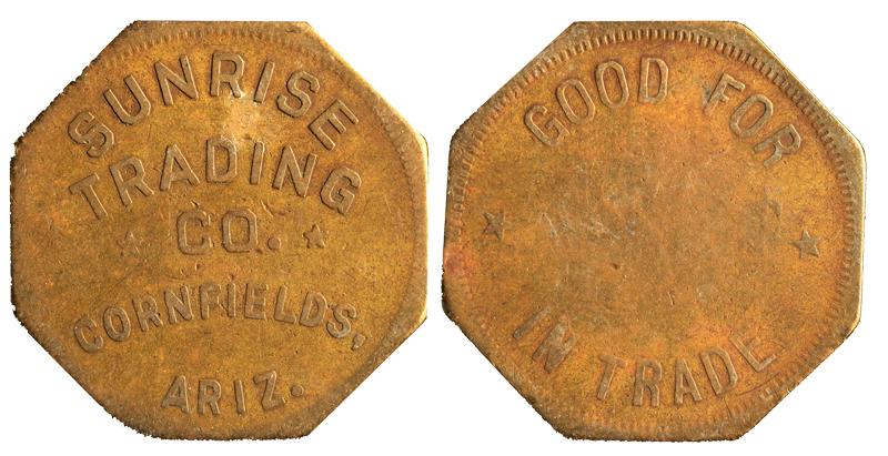 Obverse: Sunrise / Trading / co. / Cornfields / Ariz.; reverse: Good For / In Trade. No denomination, possible die trial. Fine condition.