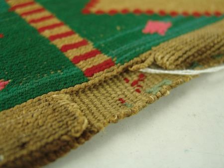 Early 1900s, Traditional handwoven medium-sized rectangular flat bag with unique colored two-sided design done in both woolens and dyed husk. Good, intact condition, with some erosion/damage on corners, and missing section on top. 12" x 9"