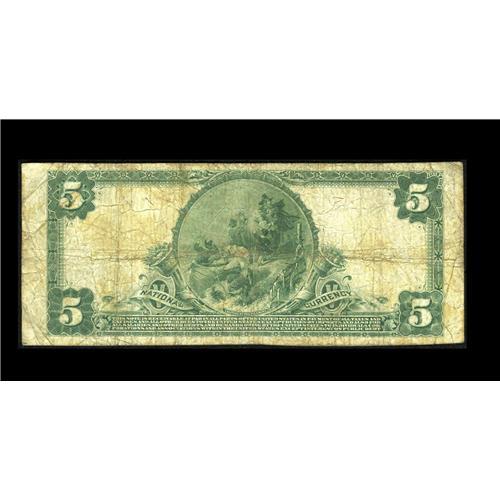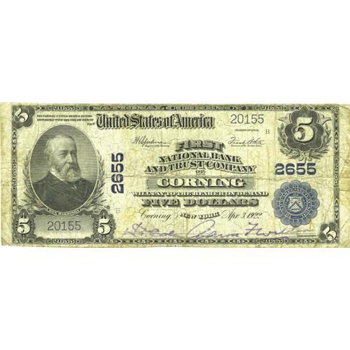 <B>Corning, NY</B></I> - $5 1902 Plain Back Fr. 609 <B>The First NB & TC</B></I> Ch. # 2655<BR>This bank issued under two titles. This is the second, under which nomenclature it elected to print only the $5 denomination in both small and large. Corning has long been known as a center for the manufacture of fine crystal. A solid <B>Fine</B></I> note with purple stamped officers' signatures remaining quite legible.