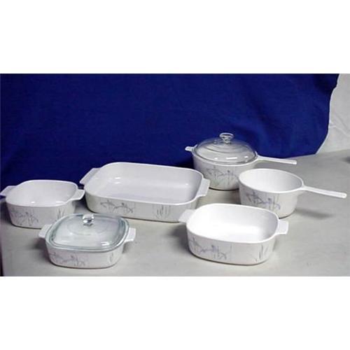 Set of Corning Ware in the Iris pattern. Includes baking dish measuring 12.25" x 2.5" x 10.5", a 1.5 liter saucepan and a 2.5 liter with lid, 3 casserole dishes in 1 liter, 1.5 liter and 2 liter with lid. All in like new condition with no nicks, chips, cracks or stains.