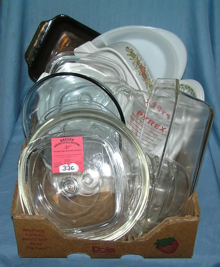 Large box full of vintage Corningware, Correlle, Glassbake, Pyrex, Anchor Hocking and more est. value $100.00-$125.00