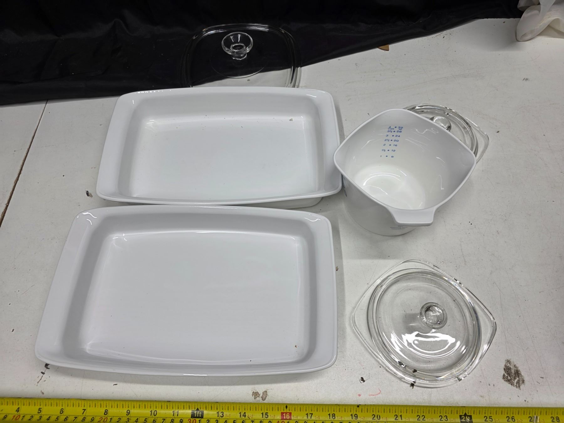 Corningware blue cornflower cake pans, 12" by 4" by 2" and 1 sauce maker with 2 lids