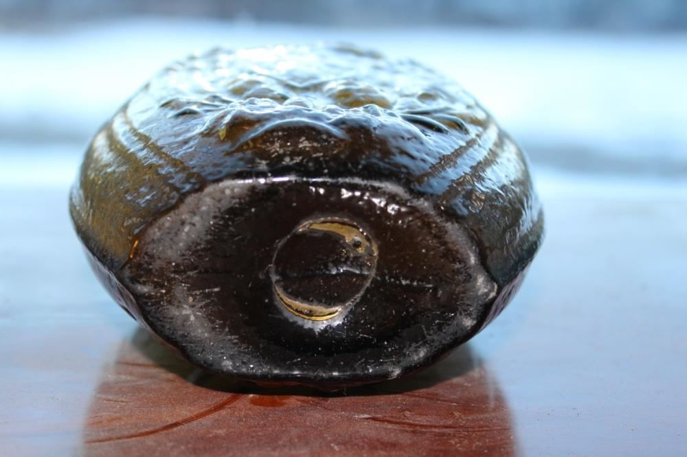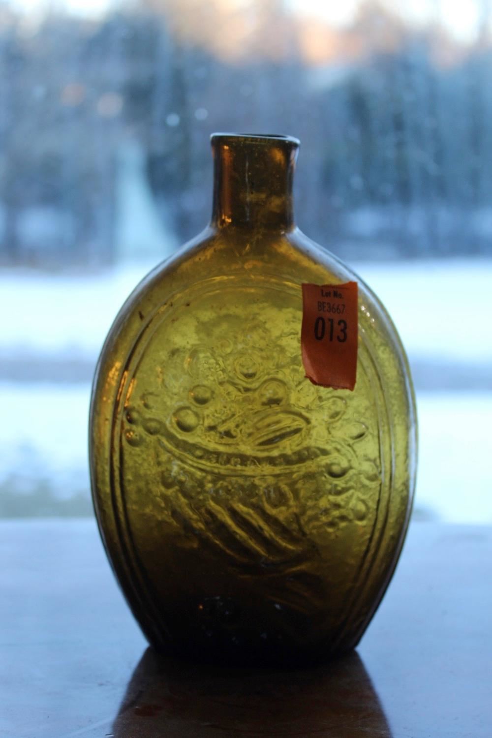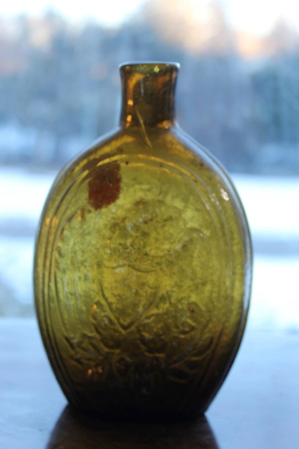 Olive Green Cornucopia flask, double sided with American Eagle and Grapes. Full pontil.