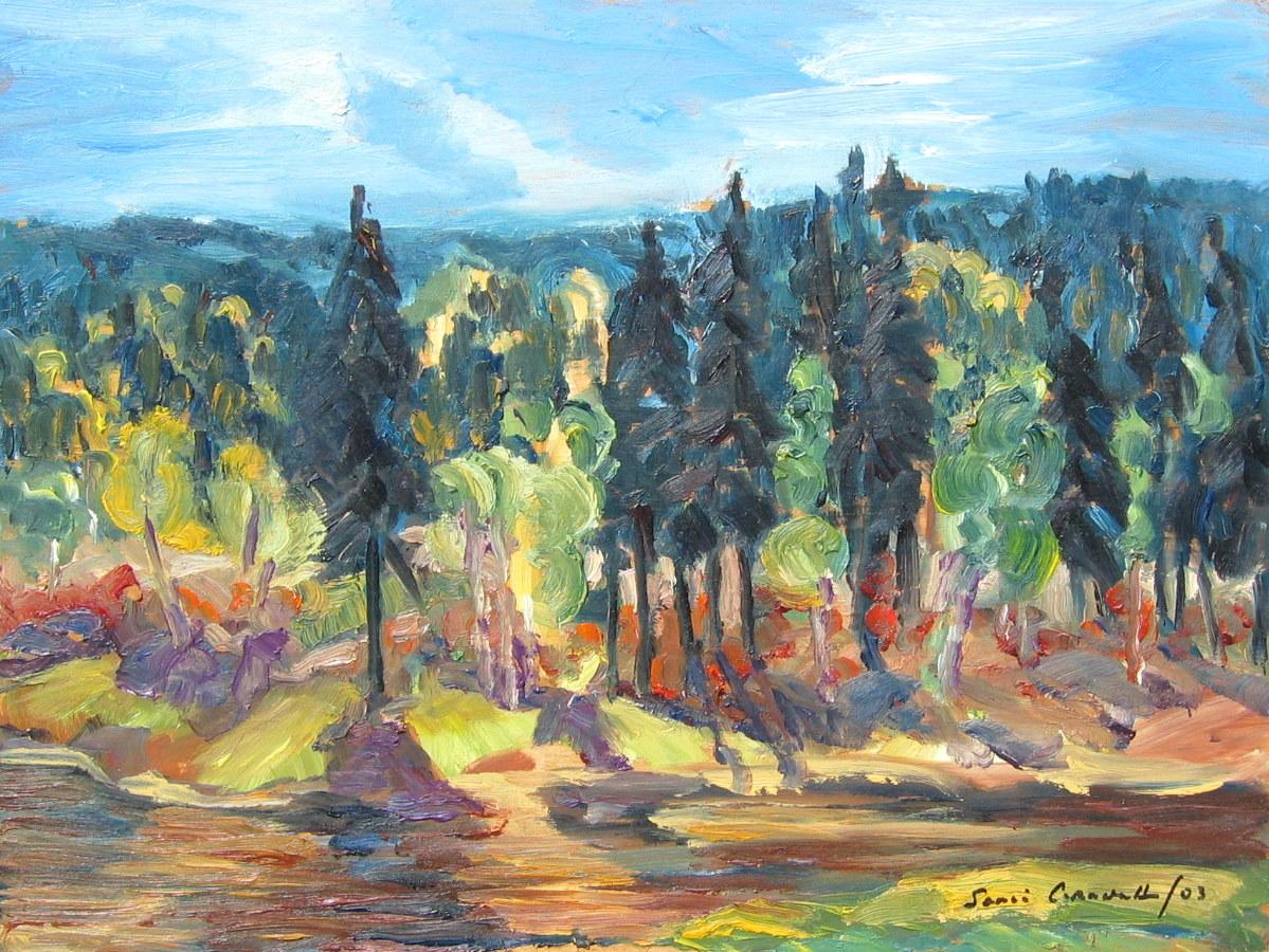 SONIA CORNWALL (Canadian, 1919 - 2006 ) Shadows by the Creek Oil on panel 12" x 16" (30.48 x 40.64cm.) Signed lower right & dated '03; signed, titled & dated verso
