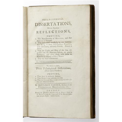 <B>Cornwallis' Personal Copy of <I>Philosophical Dissertations, with Proper Reflections.</B></I></B></I> by Benjamin Parker (London: Homer's Head, 1743), third edition (stated), 64 pages, bound in full calf with gilt raised bands, 8vo (5.5" x 9.25"). Inside this book is a small bookplate measuring 2.25" x 2.75" which depicts the Cornwallis family crest and motto "<I>Per Ardua Stabilis</B></I>" and the words "<I>Earl Cornwallis.</B></I>" With no date to go on, we can only assume it belonged to one of the five Earls of Cornwallis, one of whom is the famous General Cornwallis who fought against the American colonists in their bid for independence. <BR><BR>The book is in Fine condition; corners are slightly bumped; spine has begun to slightly separate; otherwise excellent!