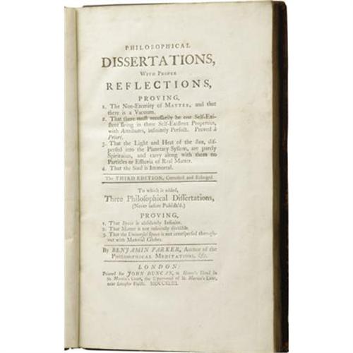 <B>Cornwallis' Personal Copy of </B></I><B><I>Philosophical Dissertations, with Proper Reflections</B></I></B></I> by Benjamin Parker (London: Homer's Head, 1743), third edition (stated), 64 pages, bound in full calf with gilt raised bands, 8vo (5.5" x 9.25"). Inside this book is a small bookplate measuring 2.25" x 2.75" that depicts the Cornwallis family crest and motto "<I>Per Ardua Stabilis</B></I>" and the words "<I>Earl Cornwallis.</B></I>" With no date to go on, we can only assume it belonged to one of the five Earls of Cornwallis, one of whom is the famous General Cornwallis who fought against the American colonists in their bid for independence. The book is in very good condition; corners are slightly bumped; spine has begun to slightly separate; otherwise excellent!<BR><BR><b>Shipping:</b> Books & Catalogs (<a target="_blank" href="http://www.heritageauctions.com/common/shipping.php">view shipping information</a>)