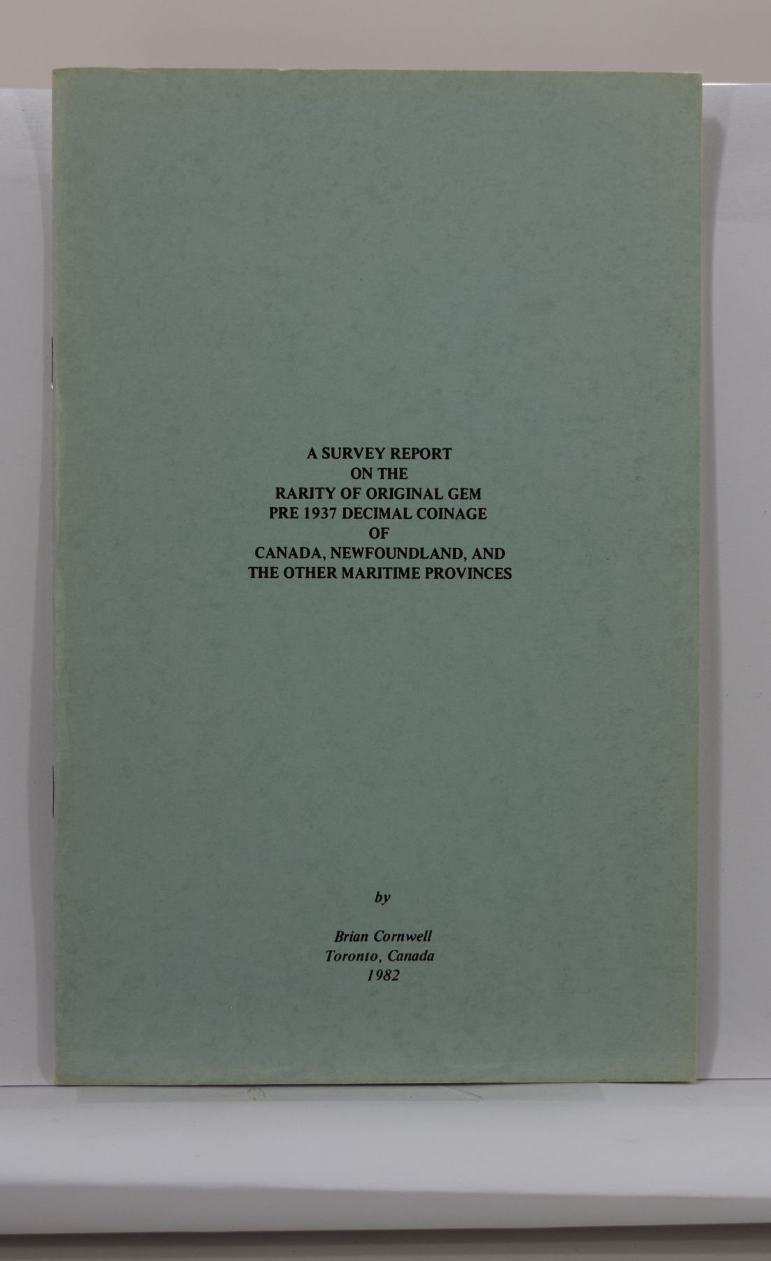 Cornwell, Brian. A SURVEY REPORT ON THE RARITY OF ORIGINAL GEM PRE 1937 DECIMAL COINAGE OF CANADA, NEWFOUNDLAND, AND THE OTHER MARITIME PROVINCES. Brian Cornwell. 1982. 12mo, 19 pages; Softcover; . Subject: Coinage - Canada