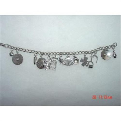 Here is a signed CORO vintage charm bracelet. My guess is this is from the 1960s? There are 14 charms, there are a ball, a true lie detector true false little charm, there is a bullet, a ashtray, a scissors that actually opens and closes, there is a ladder that actually opens up and closes, there is a chair, a fan, a baseball cap, a 4 leaf clover, a rolling pin of some sort that actually rolls, a horseshoe, a flat one and a bowling pin. This is probably rhodium metal and it is not sterling silver, this is in very good condition. This is 7 1/2 inches wide