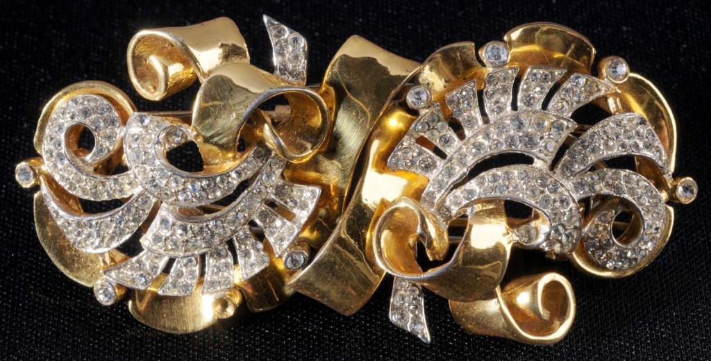 Description Pave rhinestone sprays with one missing stone and slight gold loss on ribbon. Condition (Very Good). Size 3" x 1 - 1/2".