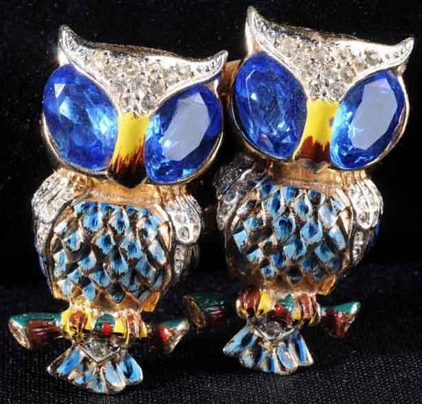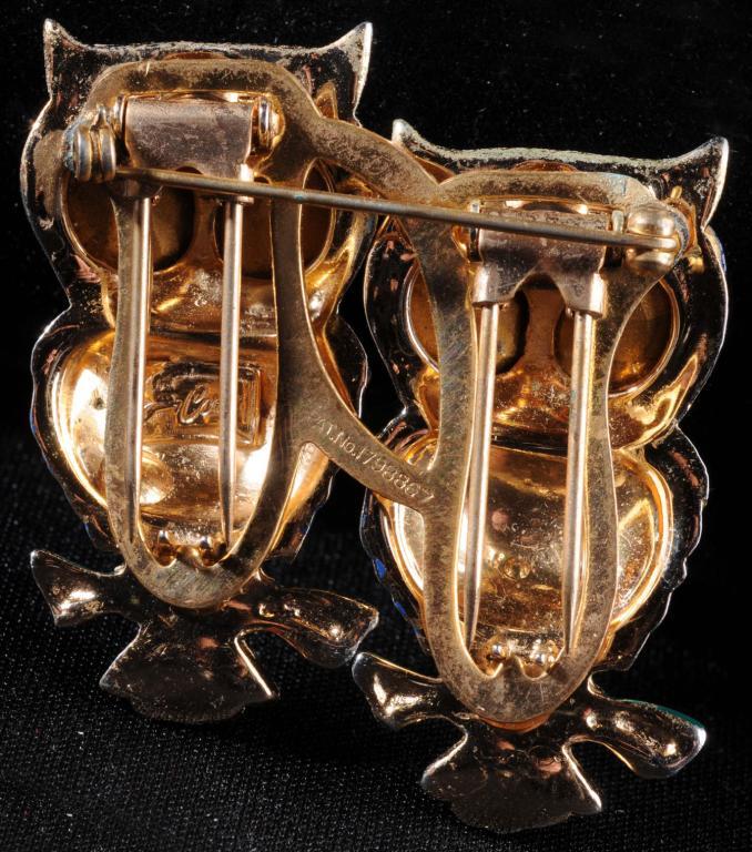 Description Blue oval rhinestone eyes with pave rhinestone head, enameled body, beaks, and branch. Slight enamel loss on beaks. Condition (Very Good). Size 2" x 2".