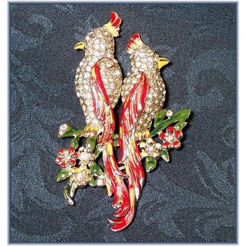 <table width="100%" border="0" cellspacing="0" cellpadding="4"><tr><td><em> Gorgeous Duette Bookpiece</em></td></tr><tr> <td width="100%"> This is a classic bookpiece, featured in many books, such as Maryann Dolan's Collecting Rhinestone and Colored Jewelry on page 208. Designed by Adolph Katz for Coro and becoming quite famous when they trademarked this unique type of brooch called the Coro Duette, patented in 1931. Actually two separate clips, that can be worn individually or as one brooch, when used with the duette piece. With a heavy rhodium plating, each bird's body is encrusted with sparkling clear pave set rhinestones, while it's feathers, beak and the flower branch it rests on are beautifully enamelled in red, yellow and green. Each flower has a clear rhinestone as it's center. Marked Coro Duette and PAT. NO 1798867, the patent number for the actual duette mechanism. Measuring 3 1/2 inches in length and 2 inches wide, it is in wonderful vintage condition, with all rhinestones present and clear and minimal age appropriate wear to the enamel. With its colorful enamel work, sparkling rhinestones and grand size, it will hardly go unnoticed. This is a mainstay for any collection. </td></tr><tr> <td> </td></tr><tr> <td>Reference #: GO_007BRCH</td></tr><tr><td>Condition:vintage, very good original condition</td></tr><tr><td>Year:circa 1930's</td></tr><tr><td>Country:usa</td></tr><tr><td>Maker:Coro</td></tr><tr><td>Height:3.5</td></tr><tr><td>Width:2</td></tr><tr><td>Title:Coro Duette Signed Bookpiece Enamel and</td></tr><tr><td>Style:Duette</td></tr><tr><td>Materials:Silvertone metal, Enamel, Rhinestones</td></tr><tr><td>Location:Lake Tahoe, California</td></tr></table>
