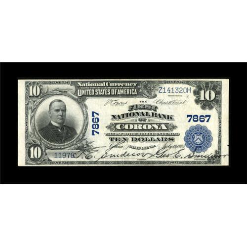 <B>Corona, CA</B></I> - $10 1902 Plain Back Fr. 625 <B>The First NB</B></I> Ch. # 7867<BR> This bank lapsed into receivership in November of 1925 on the same day as its rival, the Corona National Bank met the same fate. Tonight's example is a clean and attractive <B>Fine-Very Fine</B></I> with darkly stamped officers' signatures. We sold a Fine from here in September of 2005 at Long Beach for $1092.50. This note is a bit more attractive and should sell for no less than...<BR><I>From The Kansas City Collection.</B></I><BR><BR><b>Shipping:</b> Coins & Currency (<a target="_blank" href="http://www.heritageauctions.com/common/shipping.php">view shipping information</a>)
